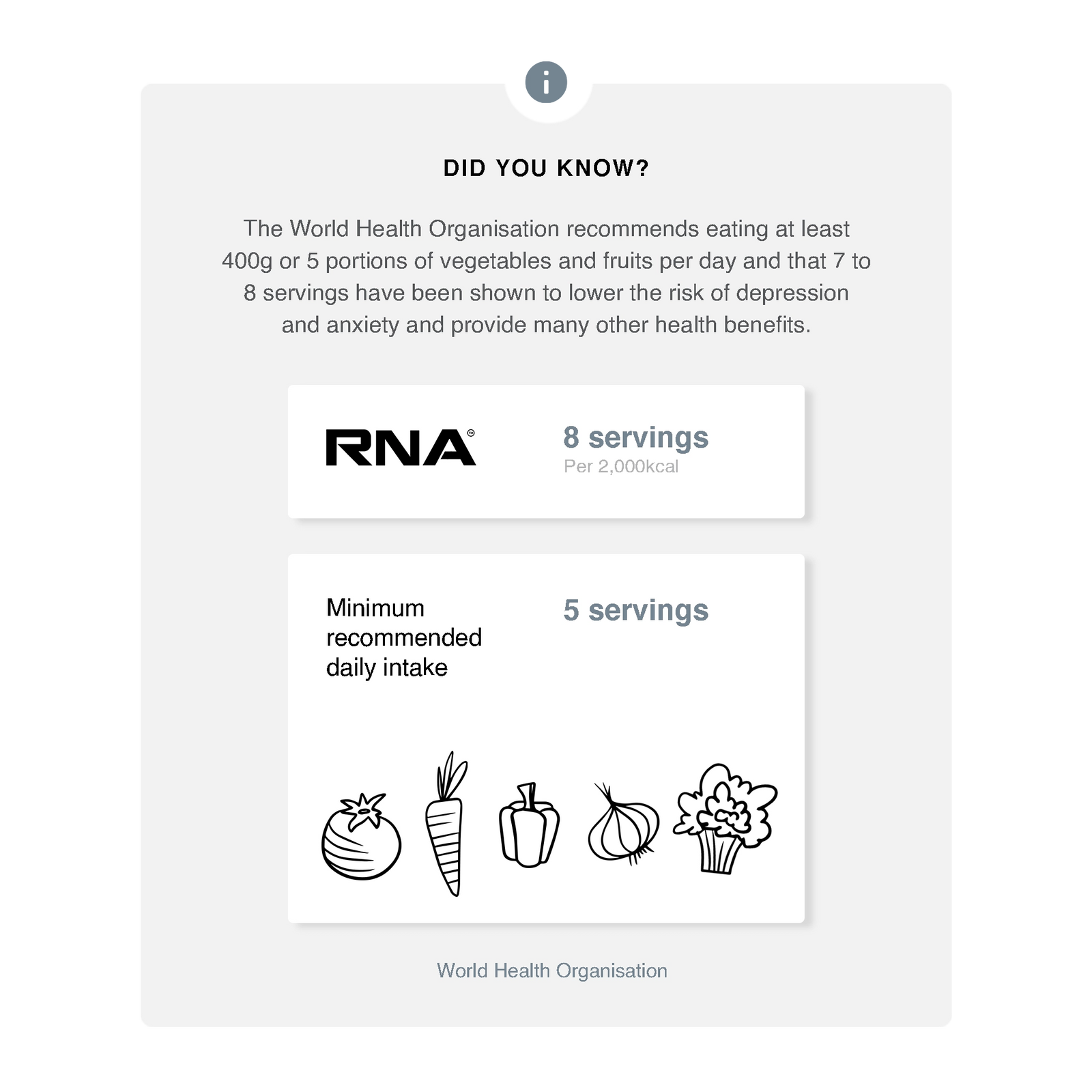 Radix Nutrition RNA provides 8 servings of fruit and vegetables per 2,000 kcal.
