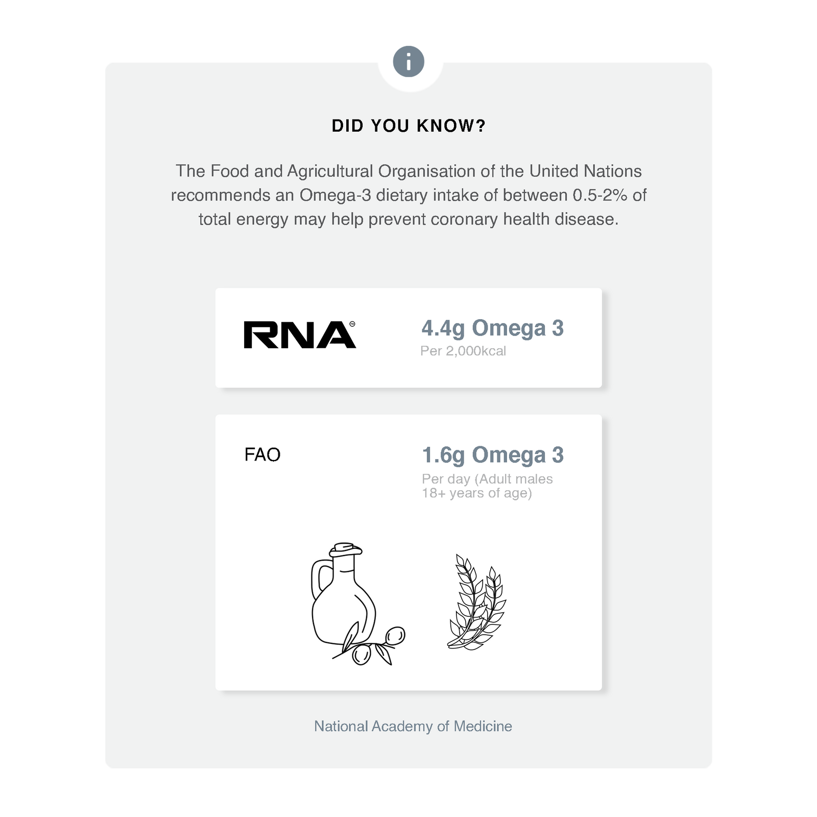 Radix Nutrition RNA provides the recommended dietary intake of Alpha-linolenic acid (ALA) and Omega-3’s from plant based ingredients.