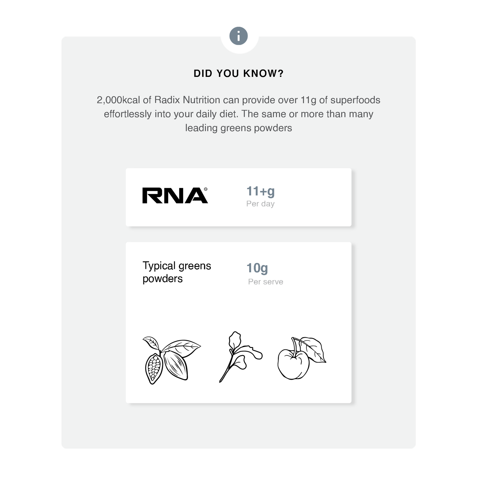 Radix Nutrition RNA provides up to 11 g of superfoods and microgreens per 2,000kcal.