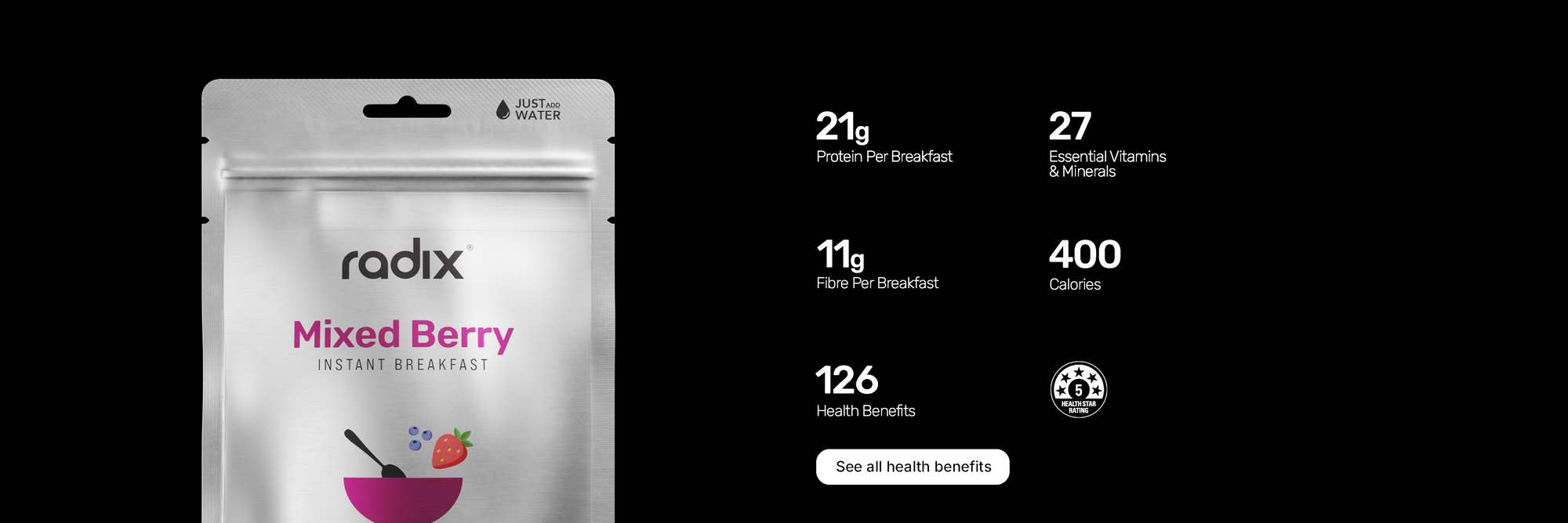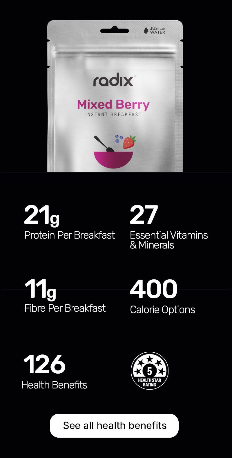 Radix Original Breakfasts are the perfect start to your day. Packed with the ideal balance of micro and macro-nutrients to keep you at your best, each serving is nutritionally balanced and made only with natural fruit, grains, seeds and superfoods.